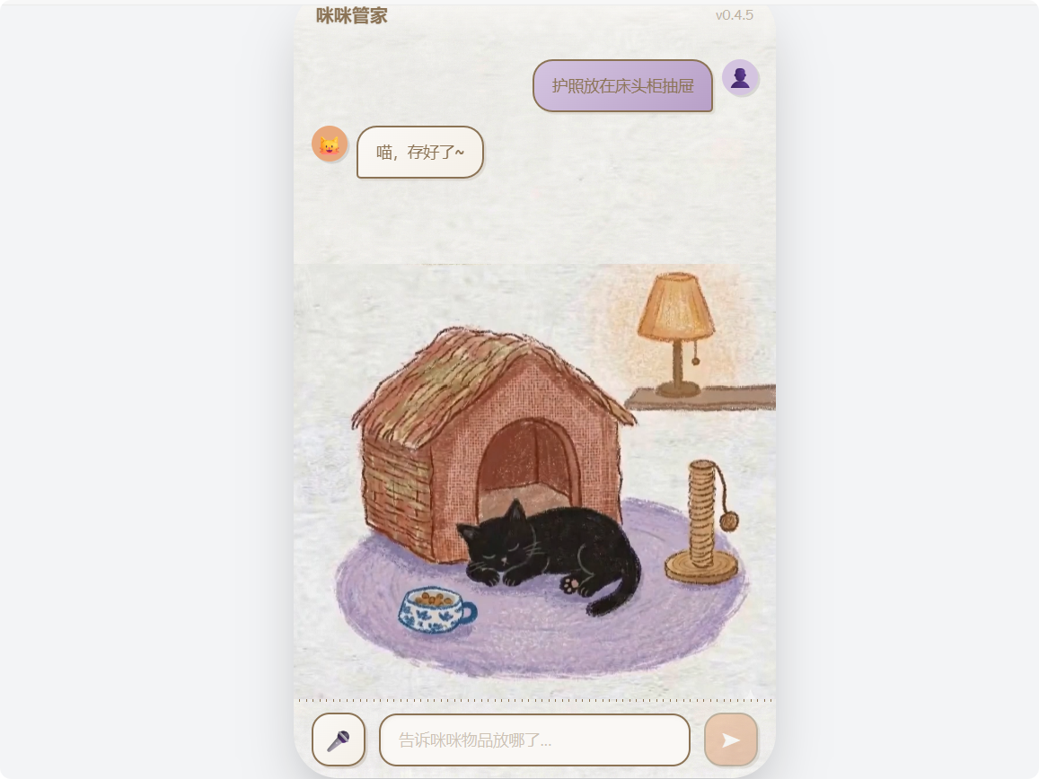 一款基于大模型构建的「绘本风 AI 寻物伴侣」,通过自然语言解析与拟人化交互,解决个人零碎物品「记不住、找不到」的痛点,提供零心智负担的个人物品云端记忆服务。